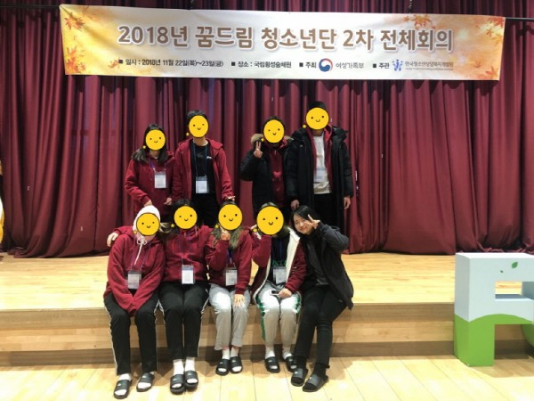2018년 인천권역 꿈드림 청소년단 '꿈꾸리' 청소년들과 2018년 꿈드림 청소년단 2차 전체회의에 참여하였습니다. 전국 청소년단이 모이는 첫번째 전체회의 및 캠프로 국립횡성숲체원에서 1박2일로 진행되었습니다. 이번 캠프에서는 숲체원 프로그램 및 권리선언문, 19년도 청소년단 활동 계획 관련 회의와 더불어 연간 각 지역 꿈드림 청소년단 연간 활동을 발표하는 경진대회가 진행되었습니다. 활동 경진대회에 인천권역 꿈드림 청소년단 '꿈꾸리' 청소년들도 참여하였으며, 최우수상을 받았습니다.