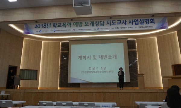 인천광역시청소년상담복지센터에서는 2018년 학교폭력 예방 또래상담 사업이 원활하게 진행될 수 있도록 또래상담 운영학교 지도교사를 대상으로 사업설명회를 진행하였습니다.