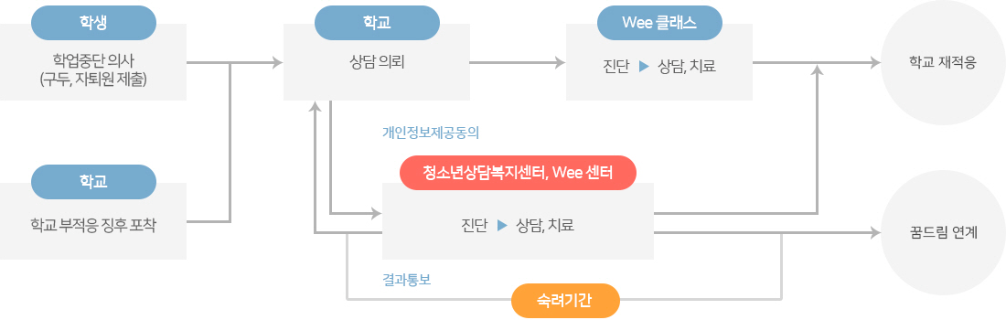 - 학업중단 숙려제 결과에 따라, 학교 적응 모니터링 또는 학교 밖 청소년 지원기관 연계